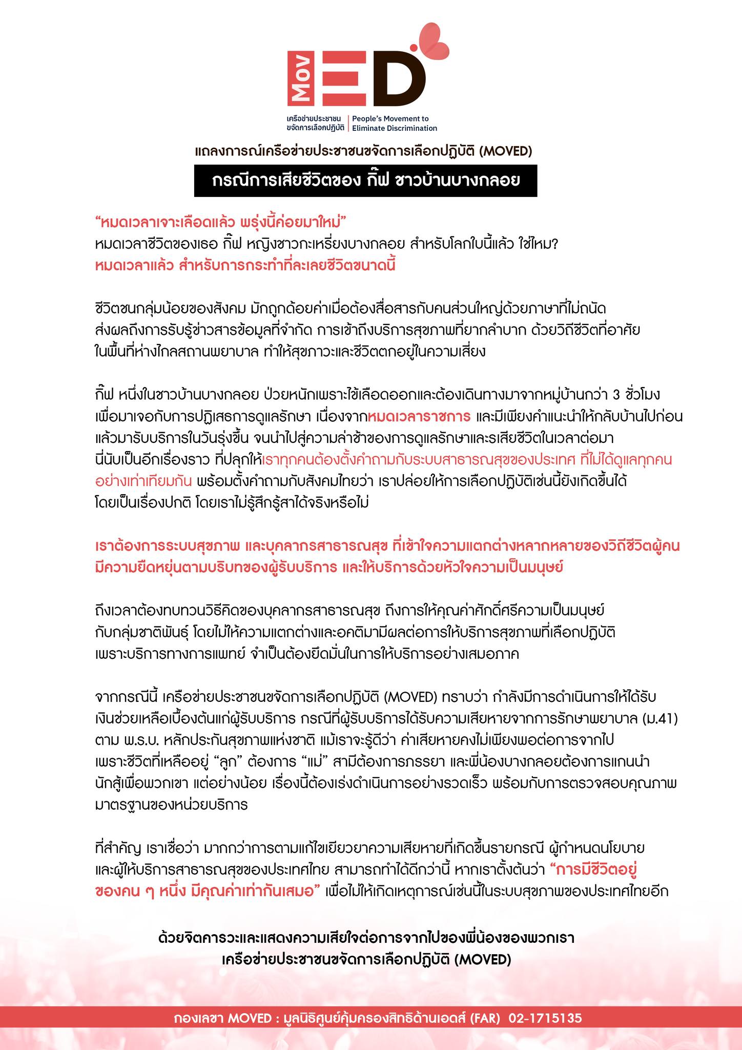 แถลงการณ์เครือข่ายประชาชนขจัดการเลือกปฏิบัติ (MovED) กรณีการเสียชีวิตของ กิ๊ฟ ชาวบ้านบางกลอย