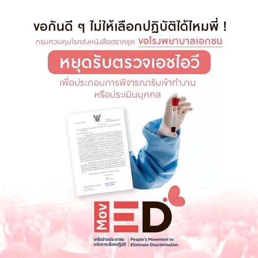 กรมควบคุมโรคส่งหนังสือตราครุฑ ขอโรงพยาบาลเอกชน หยุดรับตรวจเอชไอวีเพื่อประกอบการพิจารณารับเข้าทำงานหรือประเมินบุคคล