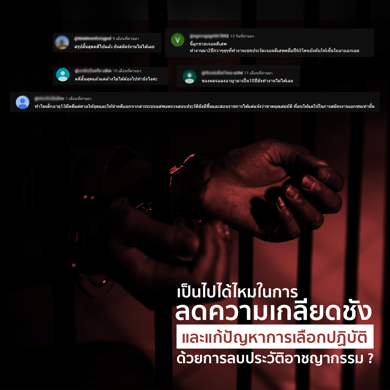 ต่อให้ในปี พ.ศ. 2566 ที่ผ่านมาได้เปิดให้มีการลบประวัติอาชญากร ซึ่งต้องมายื่นคำร้องต่อกองทะเบียนประวัติอาชญากรและดำเนินการผ่านโครงการ “ลบประวัติ ล้างความผิด คืนชีวิตให้ประชาชน*" ของสำนักงานตำรวจแห่งชาติ แต่ก็ระบุไว้เพียง 8 กรณี ซึ่งทั้งหมดนี้เจ้าตัวต้องจัดเตรียมเอกสาร และมายื่นคำร้องด้วยตนเองเป็นการยุ่งยากสร้างภาระให้ประชาชน และก็เป็นเพียงการดำเนินงานระดับ "โครงการ" หาใช่นโยบายที่ไม่มีการเปิดกว้าง ดังนั้นตราบใดที่ปัญหานี้ยังถูกมองข้าม ไม่ได้รับการแก้ไขอย่างเป็นรูปธรรม ประเทศไทยอาจต้องเผชิญความเสี่ยงกับปัญหาผู้ต้องขังล้นคุกต่อไป