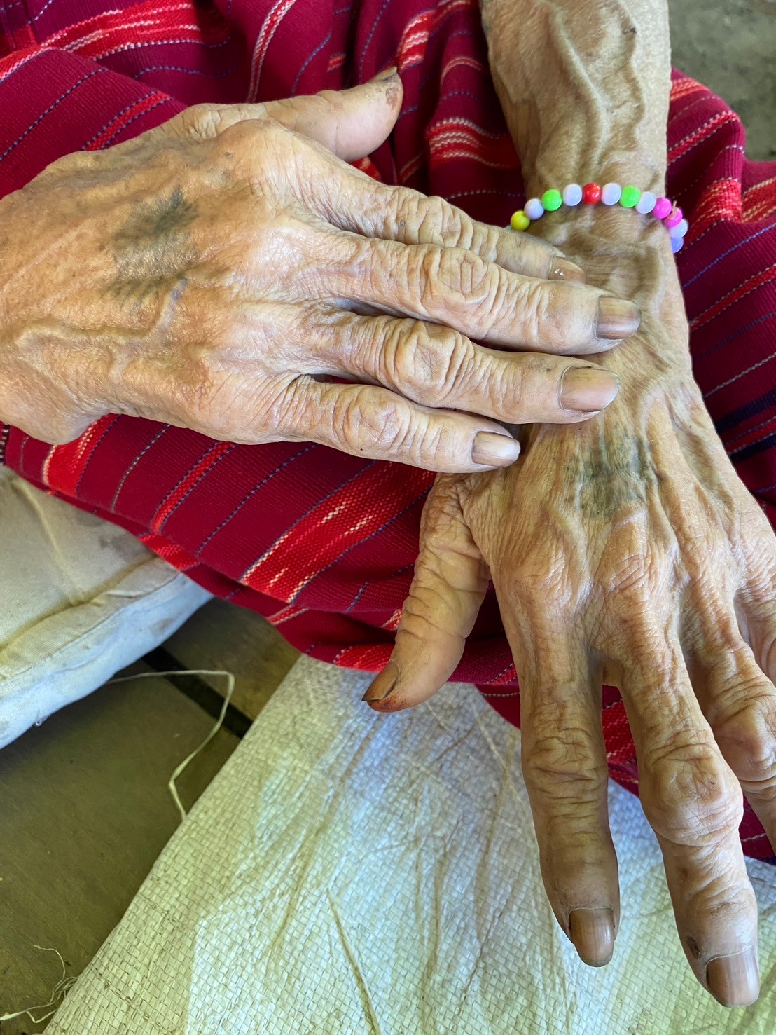 ย่าจุโพ พญาปราชญ์ วัย 88 ปี ชาวปกาเกอะญอโชว์รอยสักรูปดอกไม้หลังฝ่ามือ เธอเล่าว่า ตอนตัวเองเป็นสาวราว 16 ปีมีประสบการณ์ยืนสักโดยยื่นมือขึ้นใต้ถุนบ้านกับ ธีทอ จำได้ดีมีค่ายกขันครู 1 บาท วินาทีแรกที่เหล็กแหลมแทงเนื้อมันเจ็บแสบจนน้ำตาไหล สักไปไม่ถึงสามนาทีความเจ็บยิ่งทบทวี เมื่อเสร็จข้างหนึ่งแล้ว ยังเหลืออีกข้างก็คิดในใจว่าคงต้องพอ แต่เมื่อหันไปดูเพื่อนที่สักเสร็จก่อนหน้ายิ้มแหย ก็กลัวโดนล้อหากทำตัวละล้าละลัง... จนเมื่อเสร็จสมตามตั้งใจหวัง ความเจ็บแสบที่มีมันเลือนไป เหลือไว้แน่นเต็มอกคือความภูมิใจกับหลังมือนี้