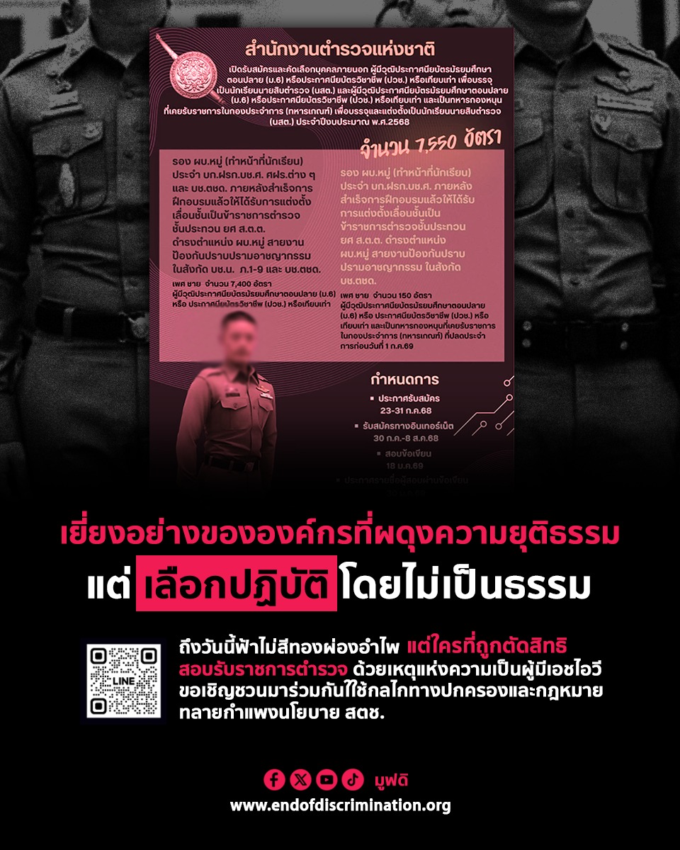 ตลอดทั้งเดือนนี้ หากบุคคลผู้สมัครสอบตำรวจท่านใด ได้รับผลกระทบและถูกตัดสิทธิด้วยเหตุผลของ ความเป็นผู้มีเชื้อเอชไอวี สามารถแสดงตนมาร่วมกับเรา ในการเรียกร้องให้มีการตรวจสอบ พิจารณา ไต่สวน เพื่อให้เกิดความเป็นธรรม ทั้งแก่ตัวท่านเอง และเป็นบรรทัดฐานแห่งการอยู่ร่วมกันภายใต้สังคมที่ “เคารพ” ความแตกต่างหลากหลายและไม่เลือกปฏิบัติ มูลนิธิเพื่อสิทธิความหลากหลาย จะจัดให้มีทนายความและนักกฎหมายผู้เชี่ยวชาญ ในการดำเนินการตามขั้นตอนภายใต้กฎหมาย ท่านที่ประสงค์ร่วมเป็นส่วนหนึ่งในการทลายอคติและการเลือกปฏิบัติของสำนักงานตำรวจแห่งชาติให้หมดสิ้นไป เพื่อไม่ให้เป็นเยี่ยงอย่างของความอยุติธรรม สามารถติดต่อมาได้ที่ “บ้านเสมอ” โทร 083-543-3608 หรือ Line @baansamer (https://lin.ee/SmTSpST)