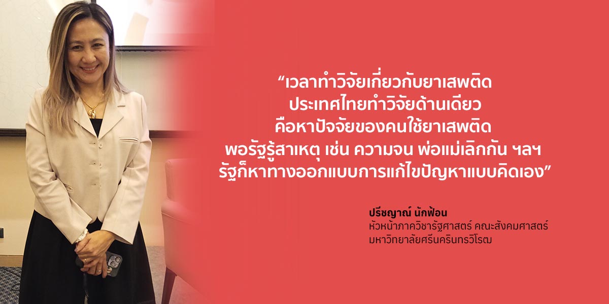ปรีชญาณ์เปิดเผยว่า เวลาทำวิจัยเกี่ยวกับยาเสพติดประเทศไทยทำวิจัยด้านเดียวคือหาปัจจัยของคนใช้ยาเสพติด พอรัฐรู้สาเหตุ เช่น ความจน พ่อแม่เลิกกัน ฯลฯ รัฐก็หาทางออกแบบการแก้ไขปัญหาแบบคิดเอง แต่ต่างประเทศเขาค้นหาปัจจัยที่ทำให้คนไม่ใช้ยาเสพติดซึ่งเป็นปัจจัยเชิงป้องกัน แล้วไปทดสอบว่าวิธีแก้ปัญหานั้นได้ผลหรือไม่ เช่น ระบบการใช้พี่เลี้ยงในโรงเรียน ก็มีการทดสอบว่าเป็นวิธีที่แก้ไขปัญหาได้หรือไม่ได้