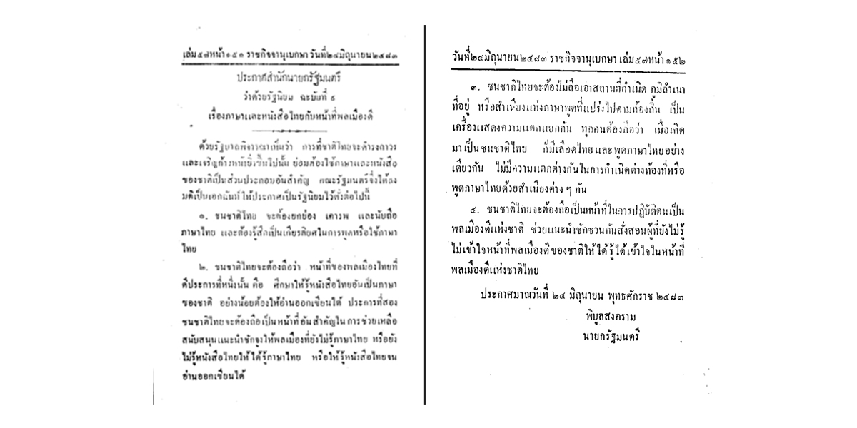 มีประกาศในราชกิจจานุเบกษา วันที่ 24 มิถุนายน 2483 ว่าด้วย “รัฐนิยมฉบับที่ 9 เรื่องภาษาและหนังสือไทยกับหน้าที่พลเมืองที่ดี” ให้ชนชาติไทยพูดและใช้ภาษาไทยขึ้นไว้เป็นหลักดำเนินการ เพื่อส่งเสริมความเป็นชาตินิยม และเพื่อให้ประชาชนเป็นเอกภาพของรัฐไทย นอกจากนี้ในเวลาเวลาต่อมารัฐได้เริ่มให้มีการร้องเพลงชาติหน้าเสาธง