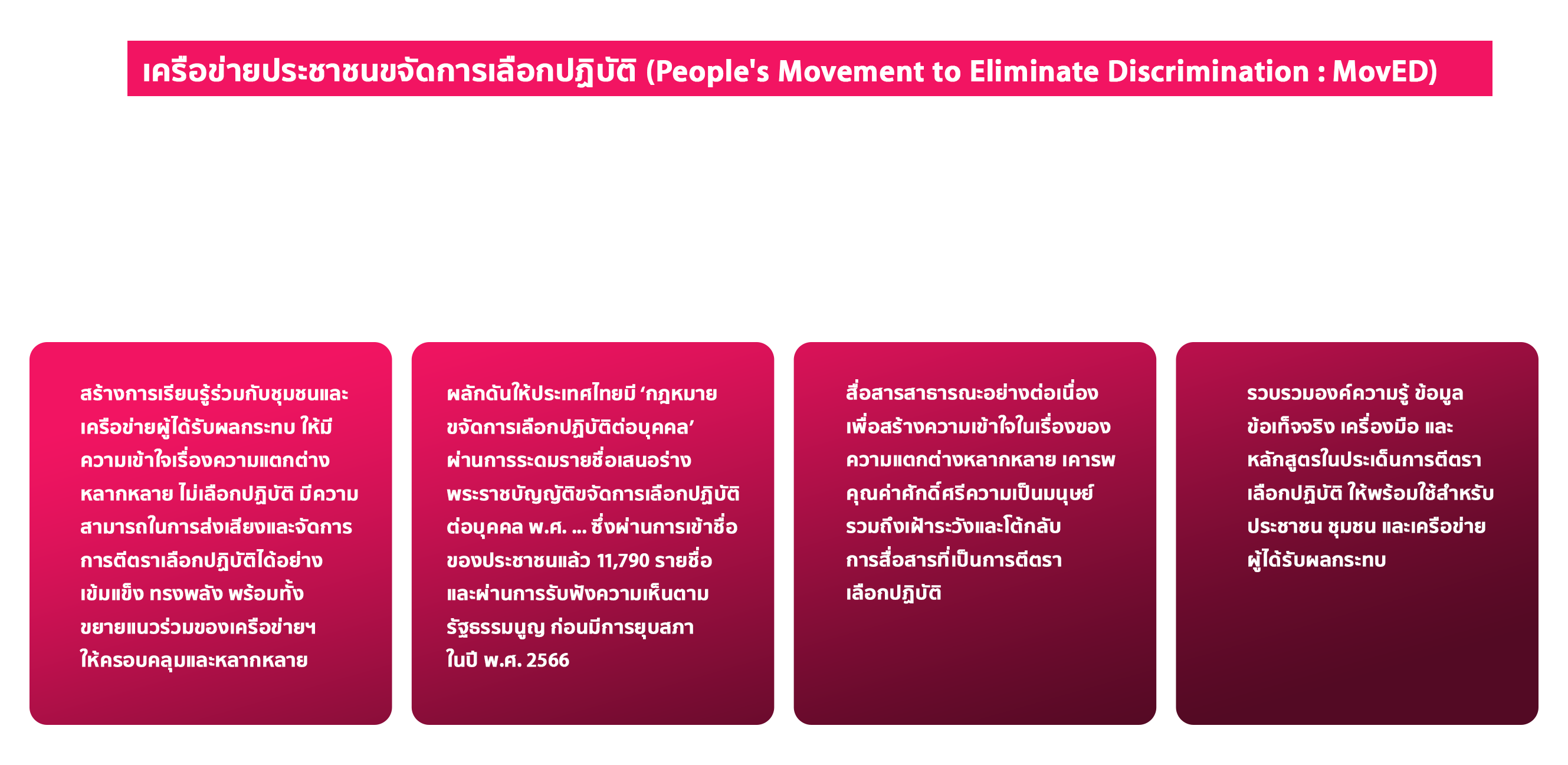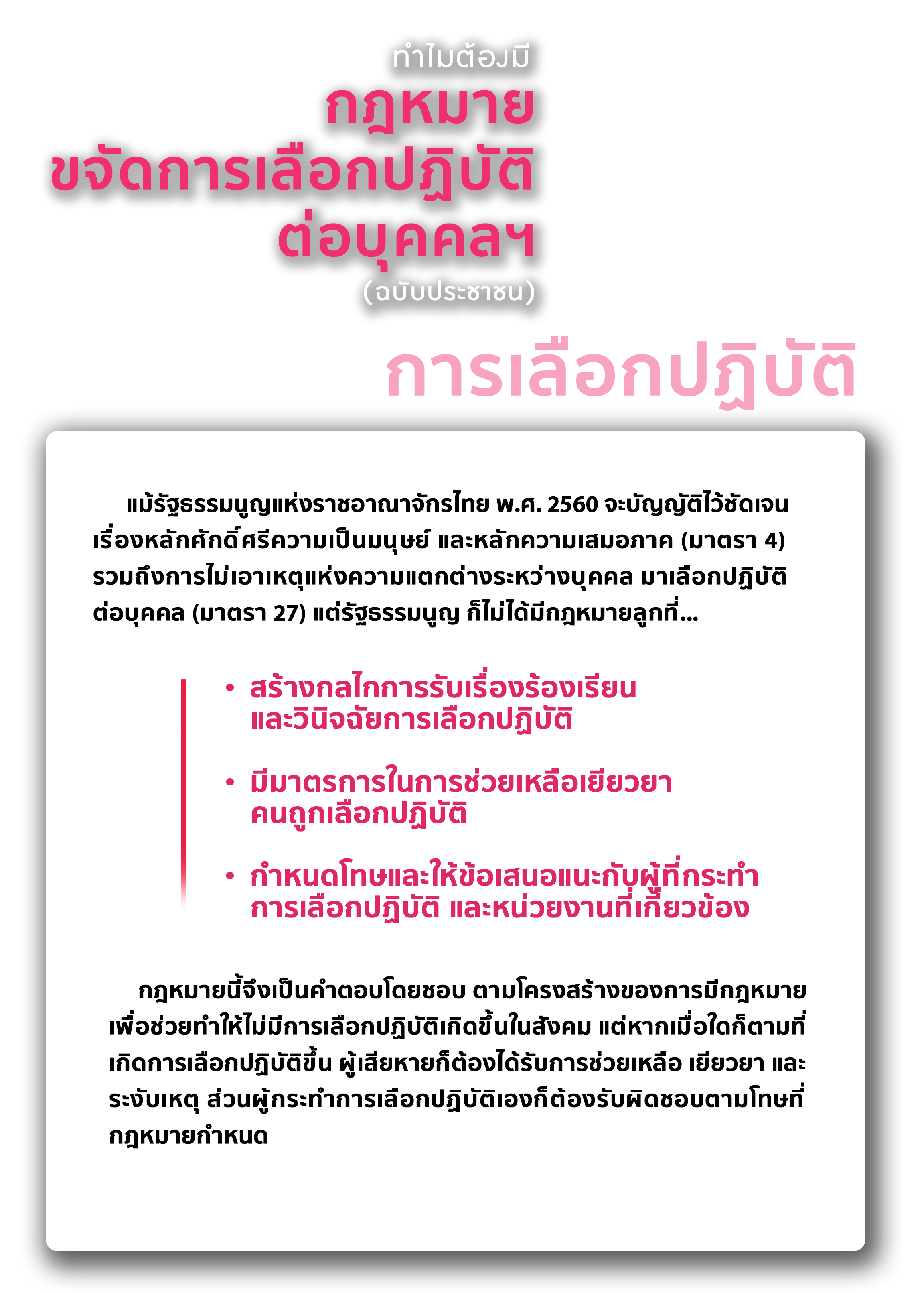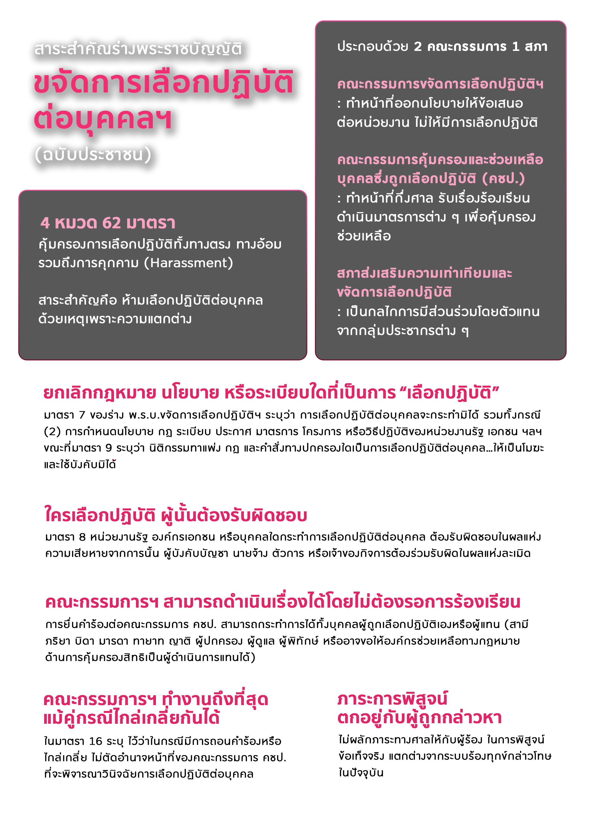 แบบทดสอบไม่เลือกปฏิบัติ จัดทำเพื่อสร้างเสริมความเข้าใจร่วมกันในการประกอบด้วย 3 ส่วน คือ การทำความรู้จักร่างพระราชบัญญัติขจัดการเลือกปฏิบัติต่อบุคคลฯ (ฉบับประชาชน) การรู้จัก และเท่าทันการตีตราและเลือกปฏิบัติ และการแนะนำให้รู้จักกับเครือข่ายประชาชนขจัดการเลือกปฏิบัติ(มูฟดิ)